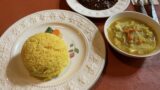 湯気とともに香るスパイス美味しそう ライスは白米とターメリックのハーフ&ハーフ