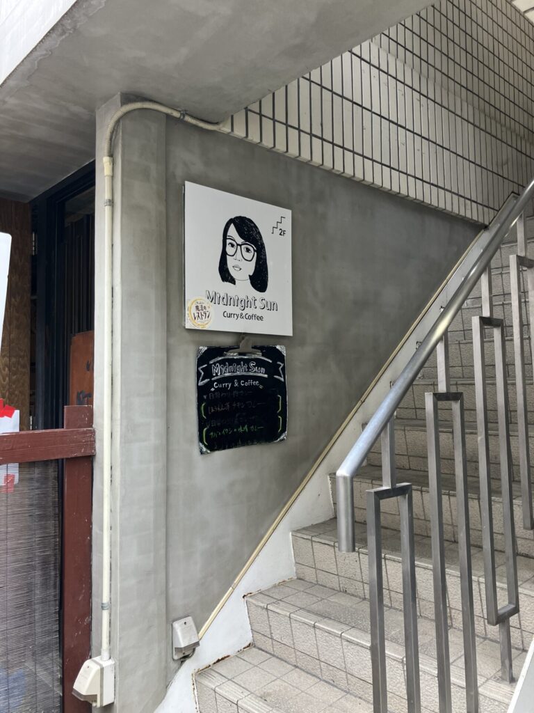 階段の店のロゴ 誰かの似顔絵目に留まる