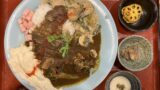 味噌煮込み牛すじとライス、カレーをすくってひとくち