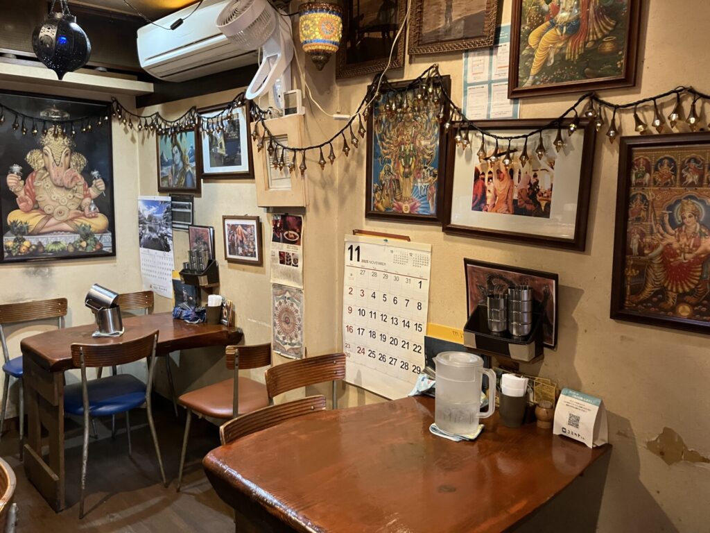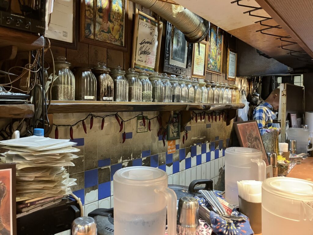カウンターの棚に並ぶは、ずらっとスパイス瓶